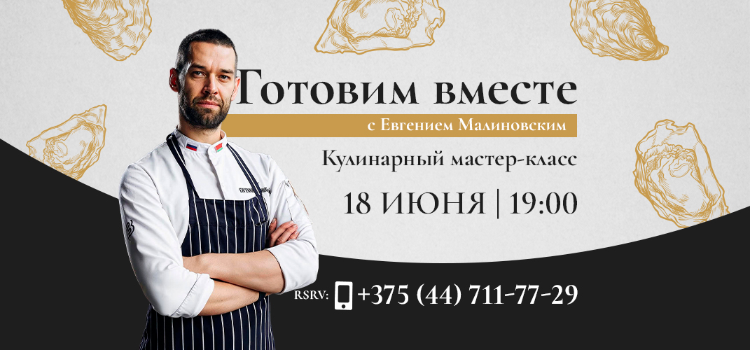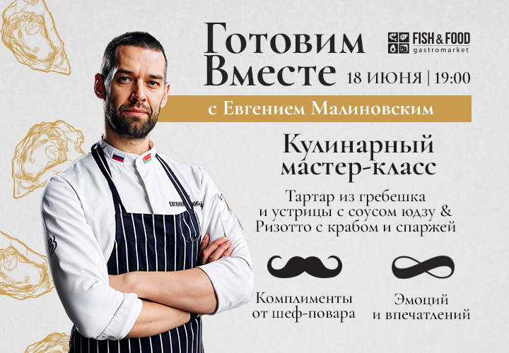 18 июня встречаемся в FISH&FOOD, чтобы не просто поужинать — а погрузиться в высокую кухню вместе с приглашённым шефом Евгением Малиновским. Каждый гость сможет принять участие в создании авторских блюд интерактивного мастер-класс.
